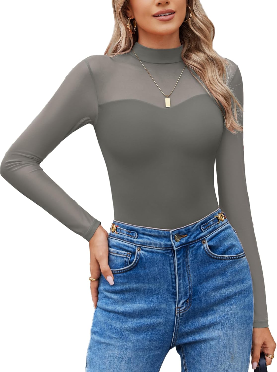 Long Sleeve Bodysuits for Women Mock Neck Sheer Mesh Sleeve Bodysuit Double Lined Leotards Shirt Going Out Top