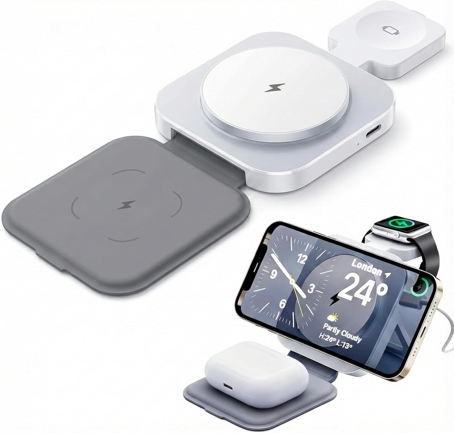 3 in 1 Upgraded Wireless Charger Charging Station: Foldable Charger Stand Multiple Devices for Apple - iPhone 16/15/14/13/12- Watch/Ultra & Airpods 4 3 2 Pro (White)